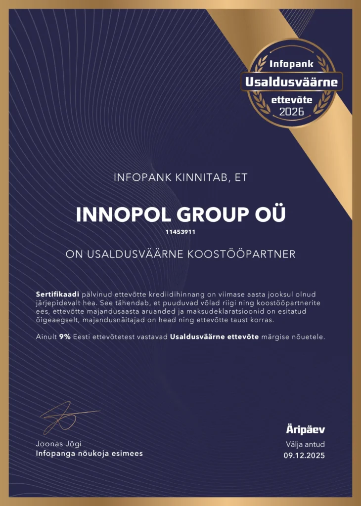 Innopol on kogemustega ehituspartner alates 2007. aastast, kes ühendab professionaalsuse, täpsuse ja kliendikesksuse. Meie eesmärk on olla tellija jaoks usaldusväärne partner, tagades, et kõik tööd on läbipaistvad, dokumenteeritud ja korrektselt teostatud.