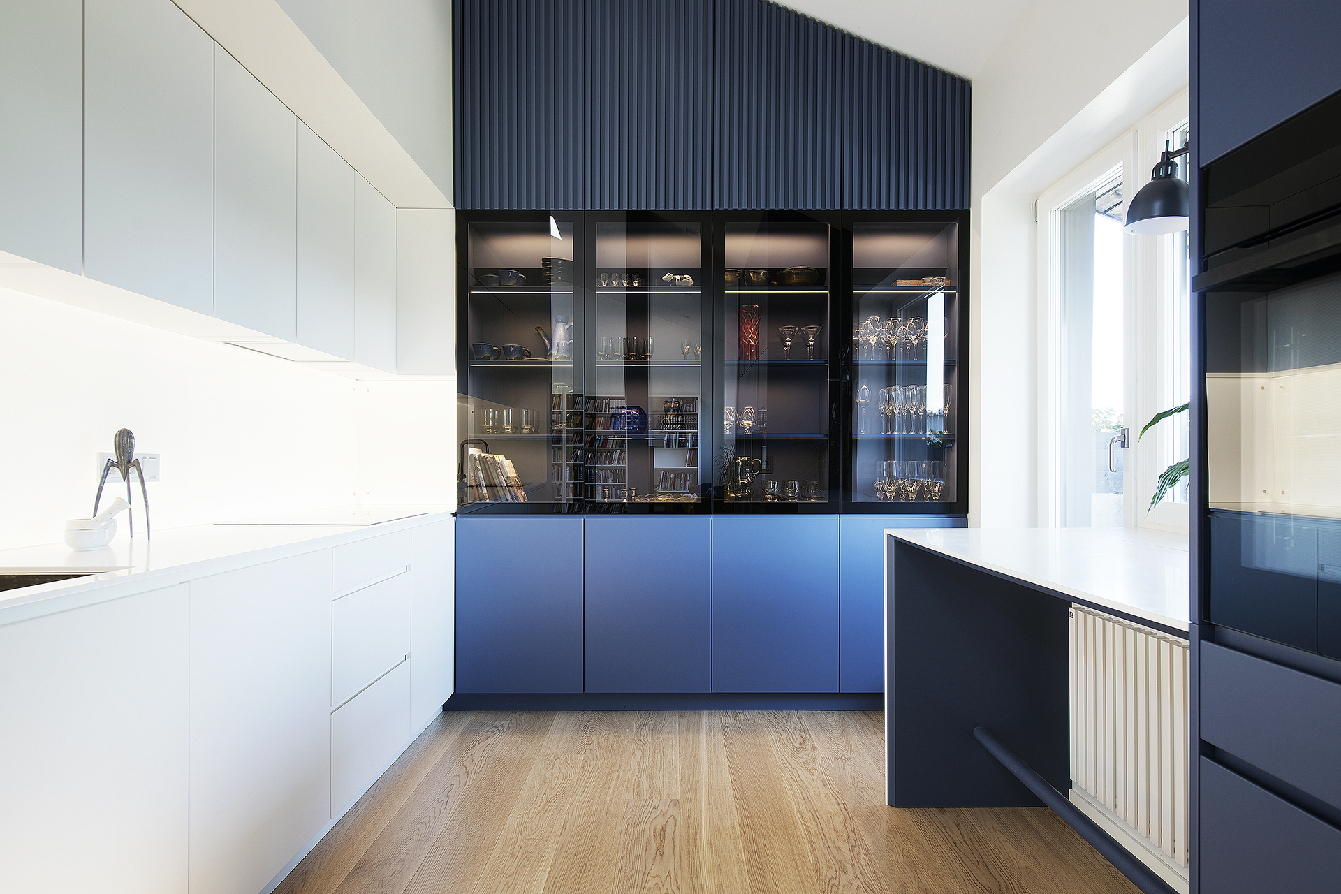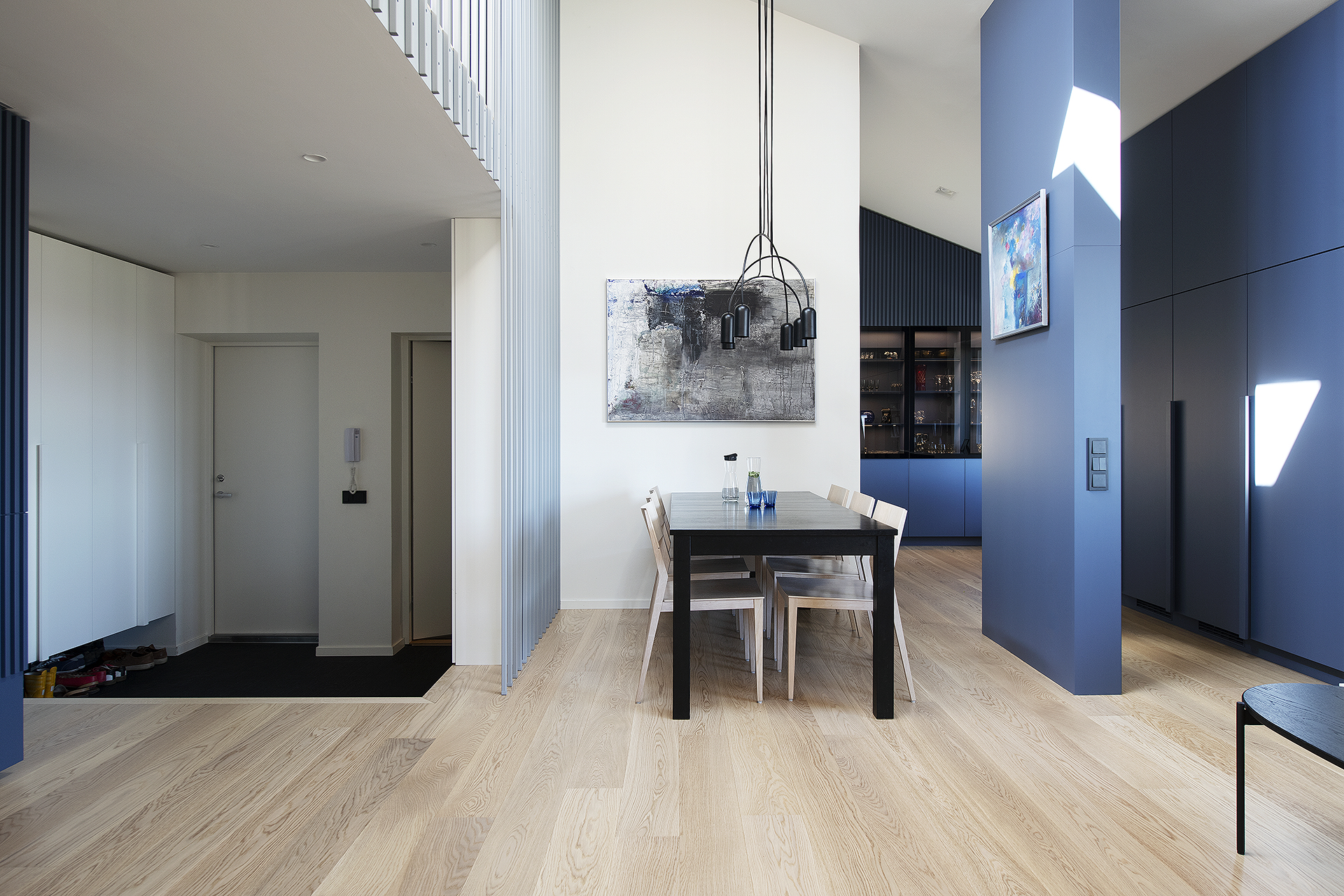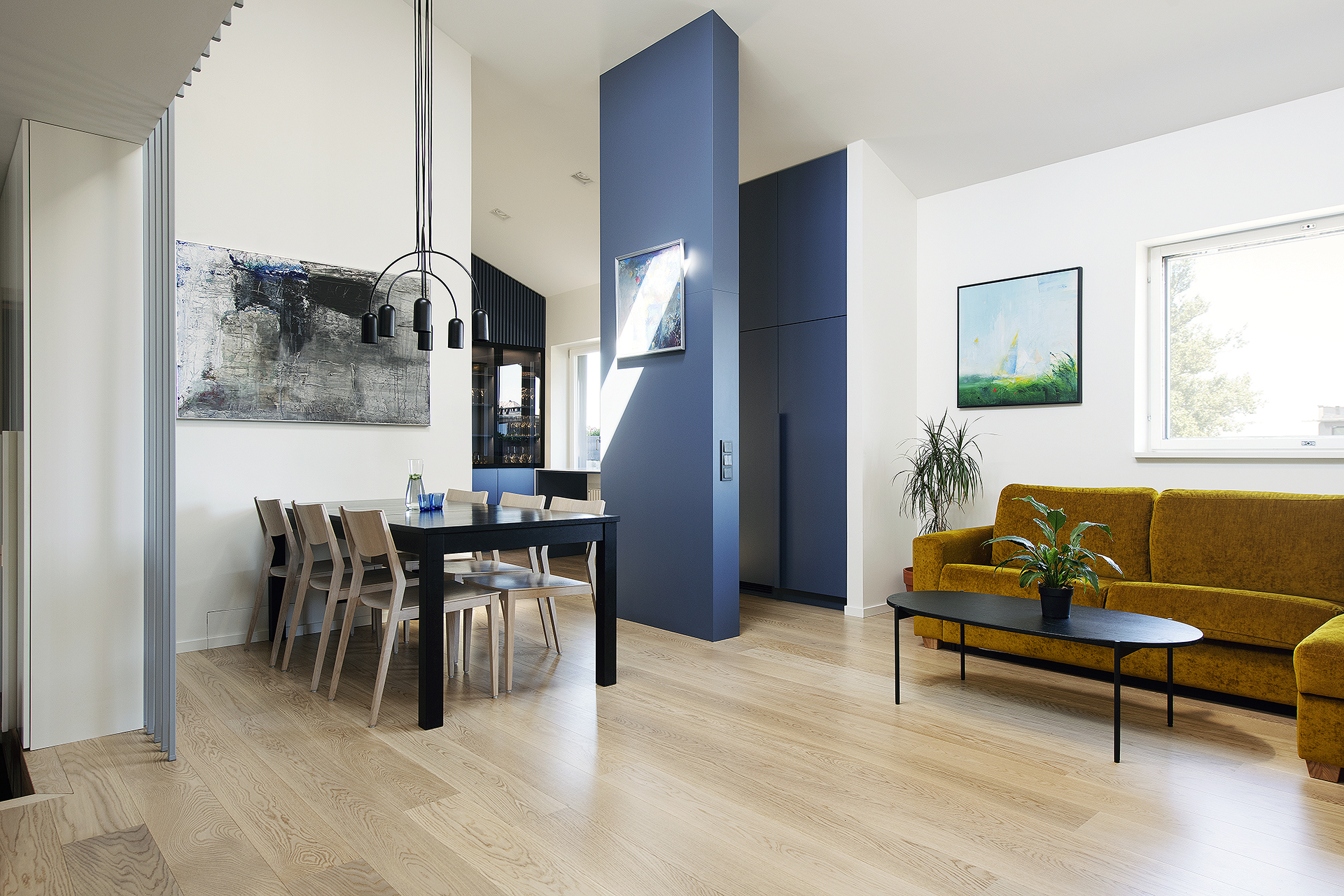 See läbi kahe korruse korter astus põhjaliku ümberehituse järel selgelt uude ajajärku – moodsamasse ja stiilsemasse, kuid samal ajal ka kodusemasse ja peresõbralikumasse. Avatud ruumilahendus, loomulik valgus ja rahulik sinine värvipalett loovad ajatu ning tasakaalus elukeskkonna. Täpselt teostatud detailid, kvaliteetsed materjalid ja sujuv üleminek korruste vahel peegeldavad ehitaja pühendumust igale etapile.