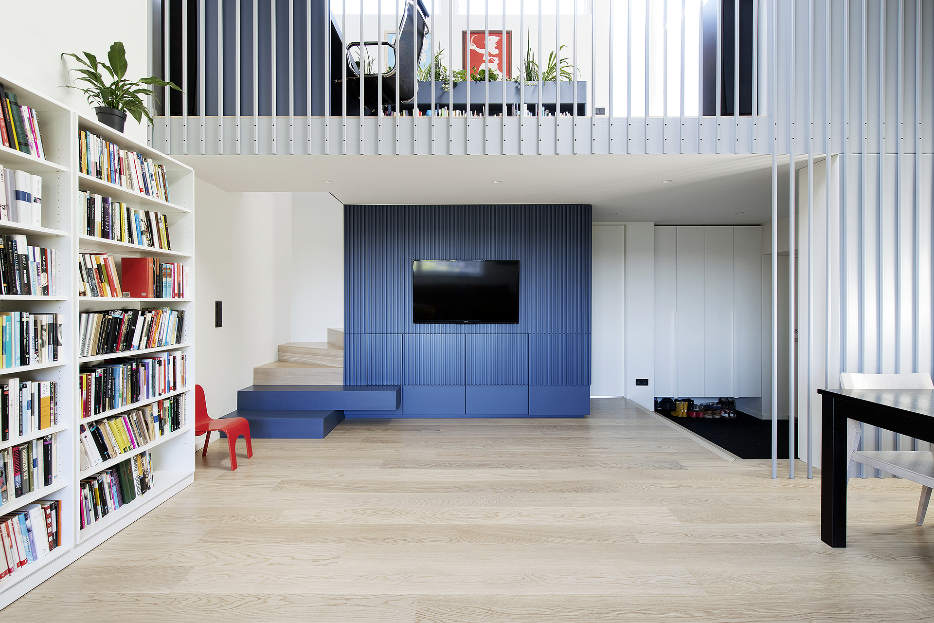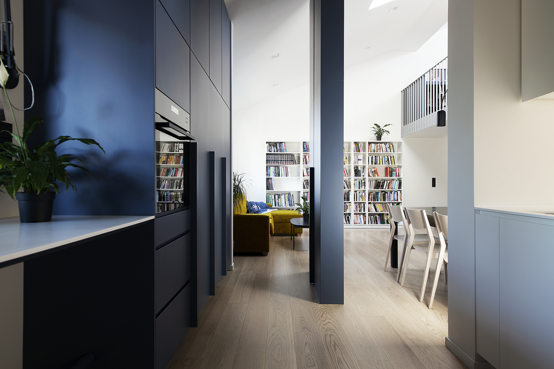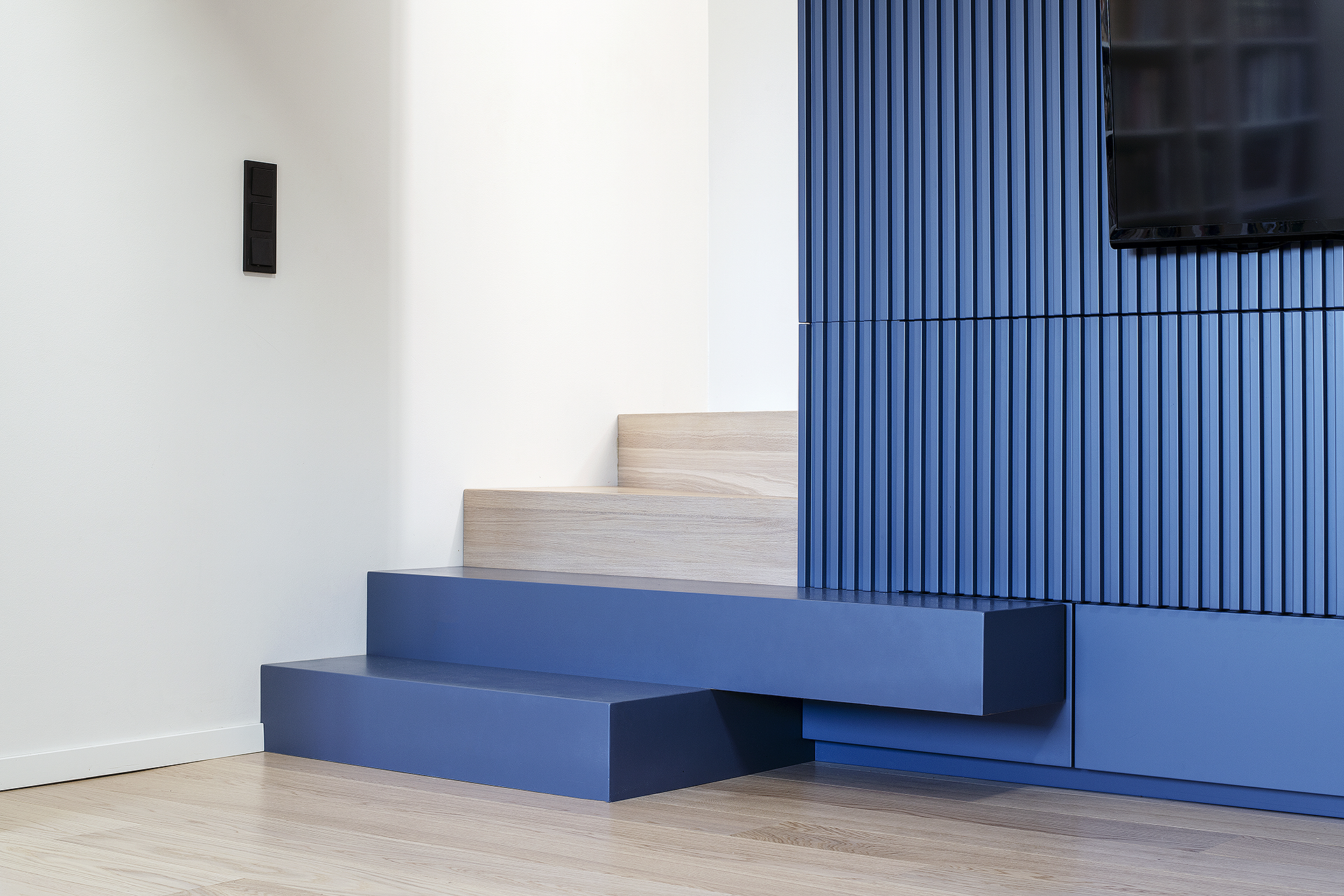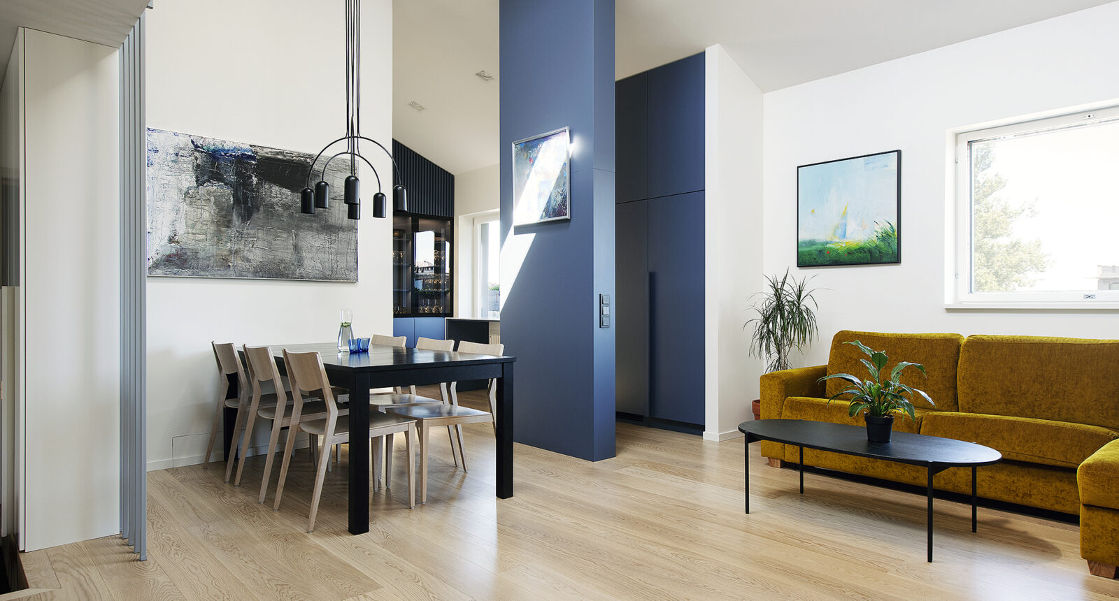 See läbi kahe korruse korter astus põhjaliku ümberehituse järel selgelt uude ajajärku – moodsamasse ja stiilsemasse, kuid samal ajal ka kodusemasse ja peresõbralikumasse. Avatud ruumilahendus, loomulik valgus ja rahulik sinine värvipalett loovad ajatu ning tasakaalus elukeskkonna. Täpselt teostatud detailid, kvaliteetsed materjalid ja sujuv üleminek korruste vahel peegeldavad ehitaja pühendumust igale etapile.